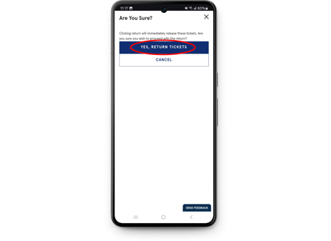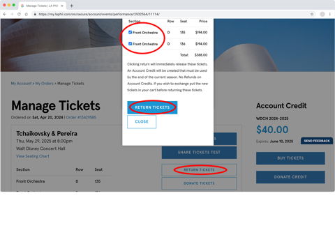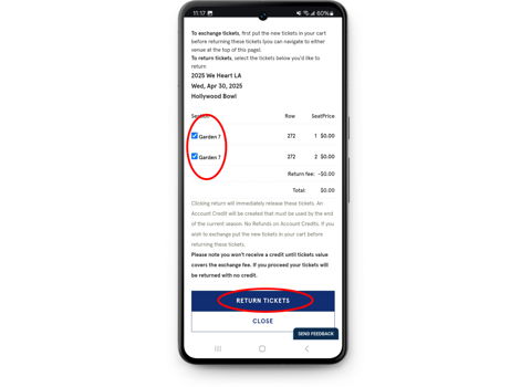 Click RETURN TICKETS. In the dialogue box, select the seats you want to exchange out of and click RETURN.