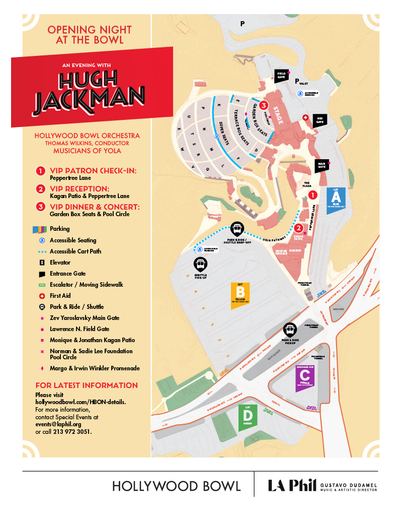 Festive summer chic. In honor of Hugh Jackman, our theme is The Greatest Showman. Guests are welcome to get into the spirit with vintage carnival-inspired touches or by wearing shades of red and gold. Please note that the Hollywood Bowl can get chilly in the evening, so we recommend checking the weather the day of the event. Coat check will be available.